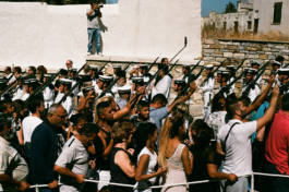 Tinos est une île très religieuse, les pèlerinages Orthodoxes y sont majeures. Nous assistons à la procession autour de l’icône de la Vierge le 23 juillet. Ce même jour, Athènes brûle.